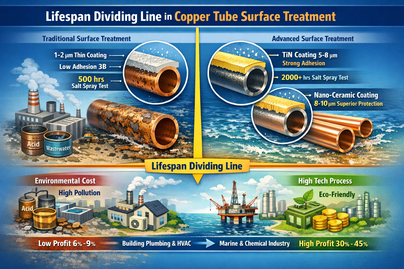 “Cả hai đều ống đồng được sử dụng trong thiết bị khử mặn nước biển , nhưng các sản phẩm chúng tôi đã xử lý tẩy chua và thụ động thông thường cho thấy sự ăn mòn rỗ và rò rỉ trong vòng chưa đầy 3 năm trong môi trường biển; trong khi sản phẩm của đối thủ cạnh tranh được xử lý bằng công nghệ mạ ion chân không , có tuổi thọ trên 15 năm và đơn giá cao hơn của chúng tôi 30% ”. Ông Liu, giám đốc kỹ thuật của một công ty ống hợp kim đồng ở Thanh Đảo, cầm trên tay hai đoạn ống đồng bỏ đi và còn nguyên vẹn, hé lộ giá trị tiềm ẩn của công nghệ xử lý bề mặt. Xử lý bề mặt, là bước cuối cùng trong sản xuất ống đồng, có vẻ giống như một hoạt động phụ trợ đơn giản là "loại bỏ rỉ sét và sơn phủ", nhưng nó trực tiếp quyết định chất lượng của sản phẩm. khả năng chống ăn mòn, chống mài mòn và cuộc sống phục vụ và further impacts its market positioning and added value. Currently, most domestic copper tube manufacturers still rely on traditional surface treatment processes such as tẩy chua và thụ động thông thường , làm cho sản phẩm của họ không phù hợp với những môi trường đòi hỏi khắt khe như xử lý nước biển, hóa chất và nước cao cấp ; Tuy nhiên, một số công ty đã nâng cấp công nghệ xử lý bề mặt tinh chế , cho phép ống đồng của họ duy trì hiệu suất ổn định trong môi trường khắc nghiệt và dễ dàng chiếm lĩnh thị trường cao cấp. Mỏng thế này" màng bảo vệ " đang trở thành chi tiết cốt lõi tạo nên sự khác biệt cho khả năng cạnh tranh của các sản phẩm ống đồng, đồng thời nó cũng là chìa khóa đưa ngành nâng cấp từ "đủ tiêu chuẩn" lên "chất lượng cao".