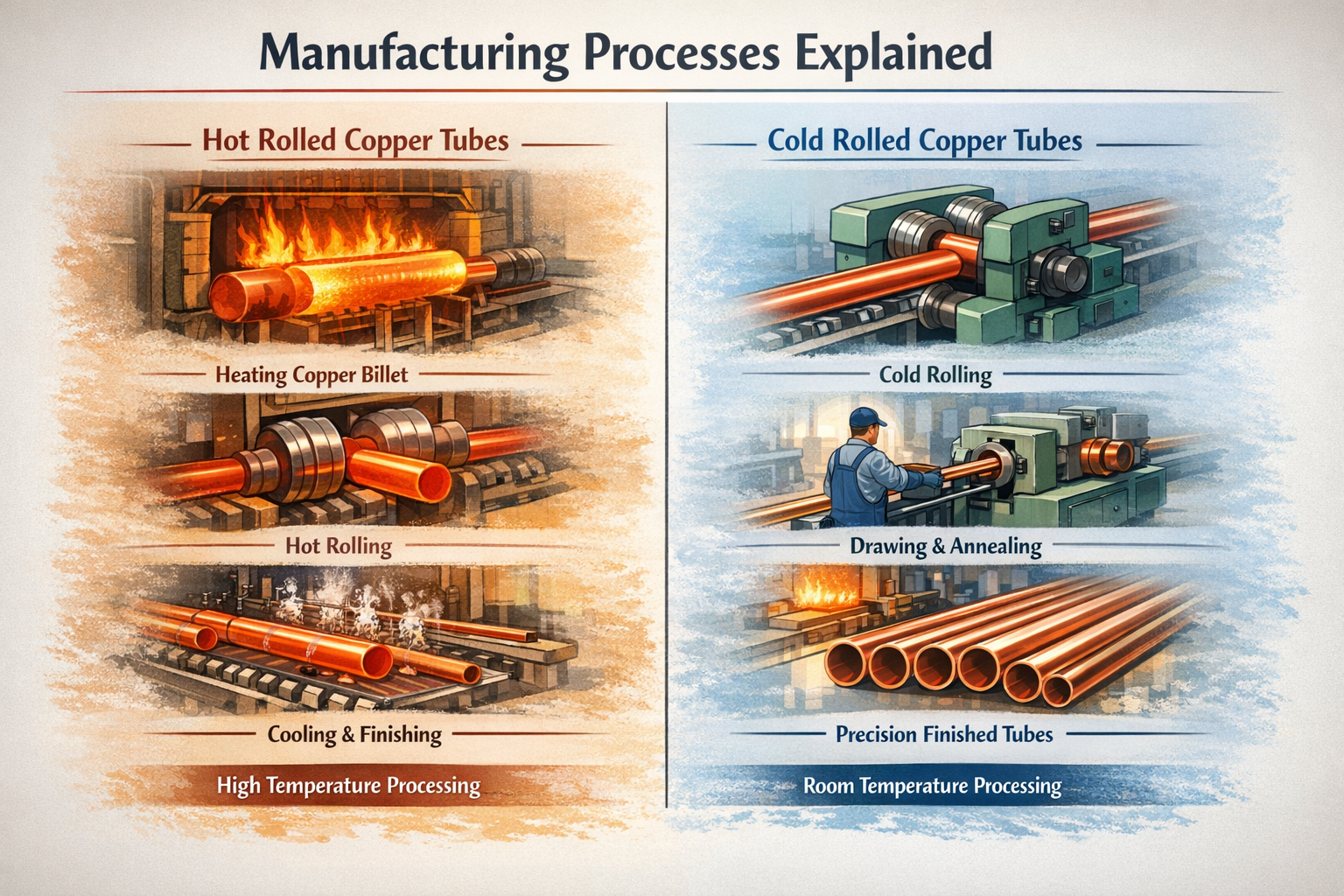 Ống đồng cán nóng được sản xuất bằng cách nung các phôi đồng trên nhiệt độ kết tinh lại và cán chúng thành dạng ống. Ở nhiệt độ cao, đồng trở nên dễ gia công hơn, cho phép tạo hình hiệu quả và sản lượng cao. Sau khi cán, các ống được làm nguội và có thể trải qua các công đoạn hoàn thiện cơ bản.