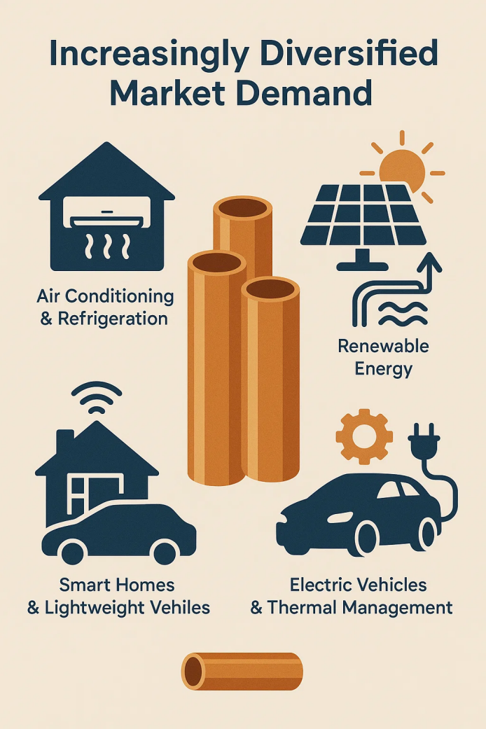 Nhu cầu thị trường trong ngành công nghiệp ống đồng cũng đang trải qua những thay đổi đáng kể. Với sự thay đổi khí hậu toàn cầu và nhận thức về môi trường ngày càng tăng, nhu cầu về các ống đồng trong các lĩnh vực điều hòa không khí, điện lạnh và năng lượng tái tạo đang tăng lên. Đặc biệt, trong ngành năng lượng mới, các ống đồng, do độ dẫn nhiệt tuyệt vời và khả năng chống ăn mòn, đã trở thành vật liệu chính trong các thiết bị năng lượng như năng lượng mặt trời và địa nhiệt.