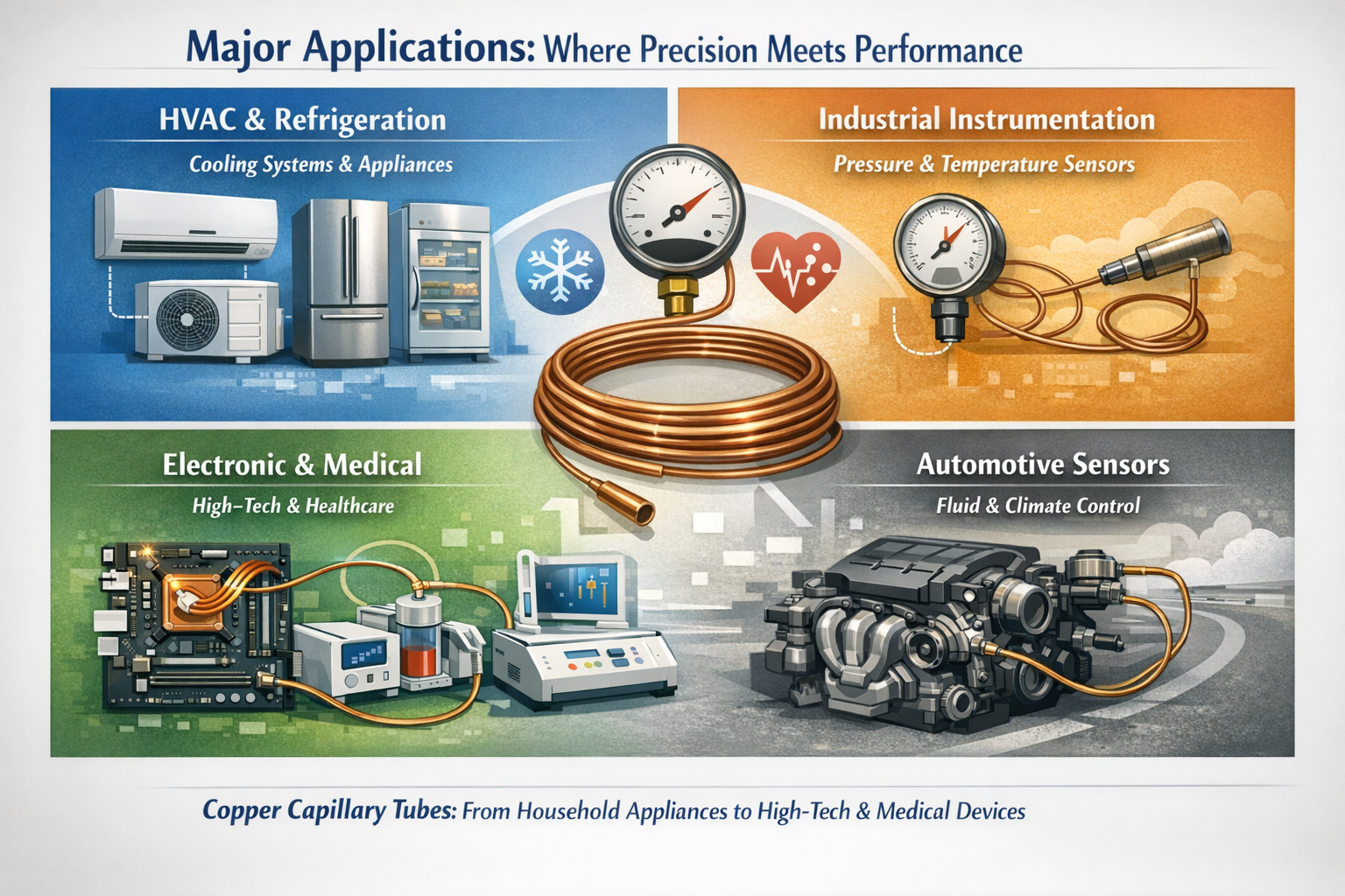 Việc sử dụng phổ biến nhất cho ống mao dẫn đồng là trong ngành HVAC (Sưởi ấm, thông gió và điều hòa không khí). Nó đóng vai trò chính thiết bị đo trong các hệ thống làm mát quy mô vừa và nhỏ.