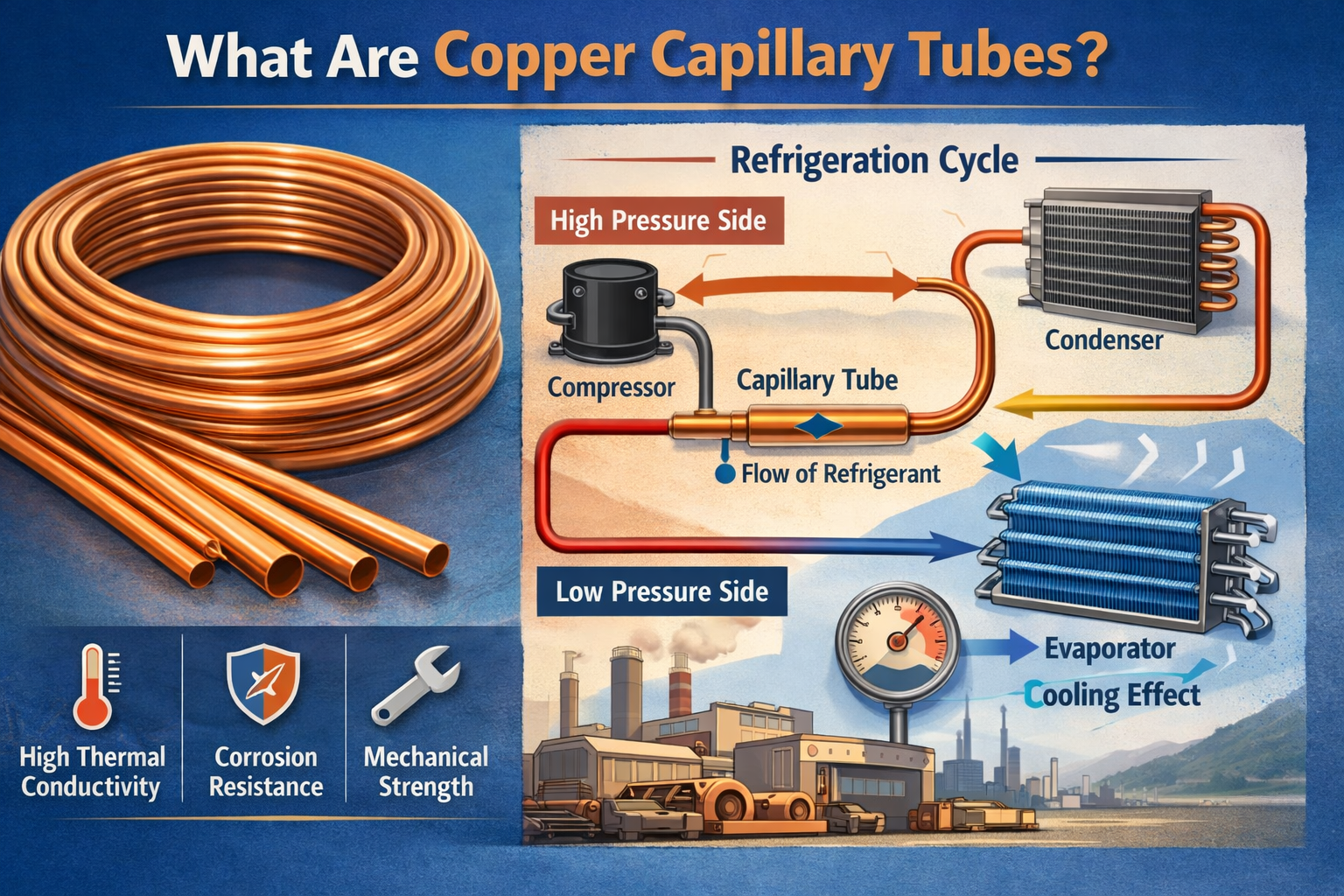 Hệ thống điện lạnh rất cần thiết trong cuộc sống hiện đại, từ việc bảo quản thực phẩm và thuốc men đến việc duy trì sự thoải mái trong nhà và nơi làm việc của chúng ta. Một trong những thành phần quan trọng đảm bảo hoạt động hiệu quả của các hệ thống này là ống mao dẫn . Trong số các vật liệu khác nhau được sử dụng cho ống mao dẫn, đồng đã được chứng minh là một sự lựa chọn lý tưởng do tính chất độc đáo của nó.