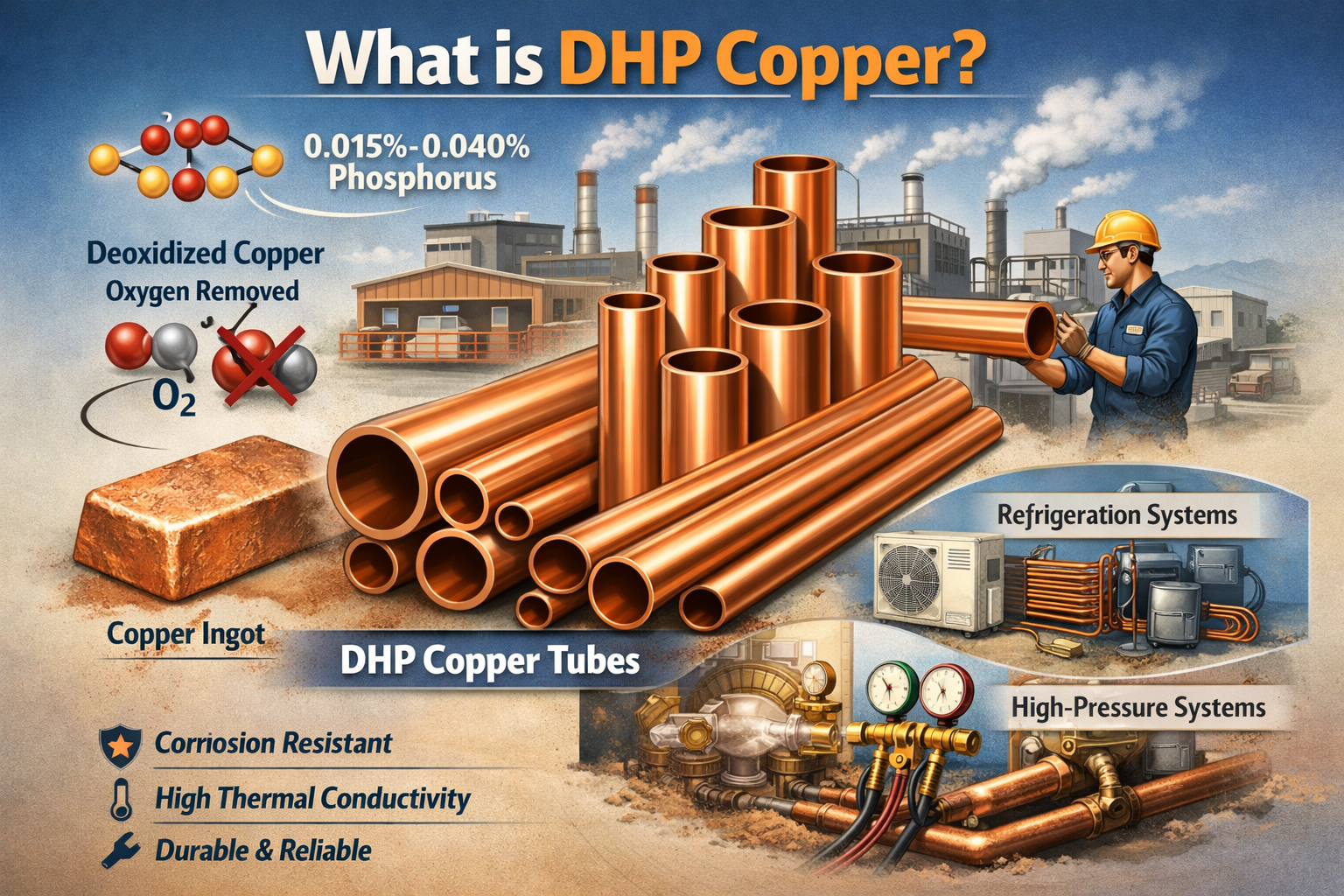 đồng DHP là chất lượng cao, đồng khử oxy hợp kim có chứa một lượng nhỏ phốt pho , thường là từ 0,015% đến 0,040%. Đặc điểm chính của loại đồng này là nó đã được xử lý để loại bỏ oxy, một quá trình giúp cải thiện khả năng chống ăn mòn và đảm bảo hiệu suất tốt hơn trong các hệ thống áp suất cao. Hàm lượng phốt pho tăng cường hơn nữa các đặc tính của nó, khiến nó trở nên lý tưởng để sử dụng trong các ứng dụng đòi hỏi độ bền, độ dẫn nhiệt và độ bền.