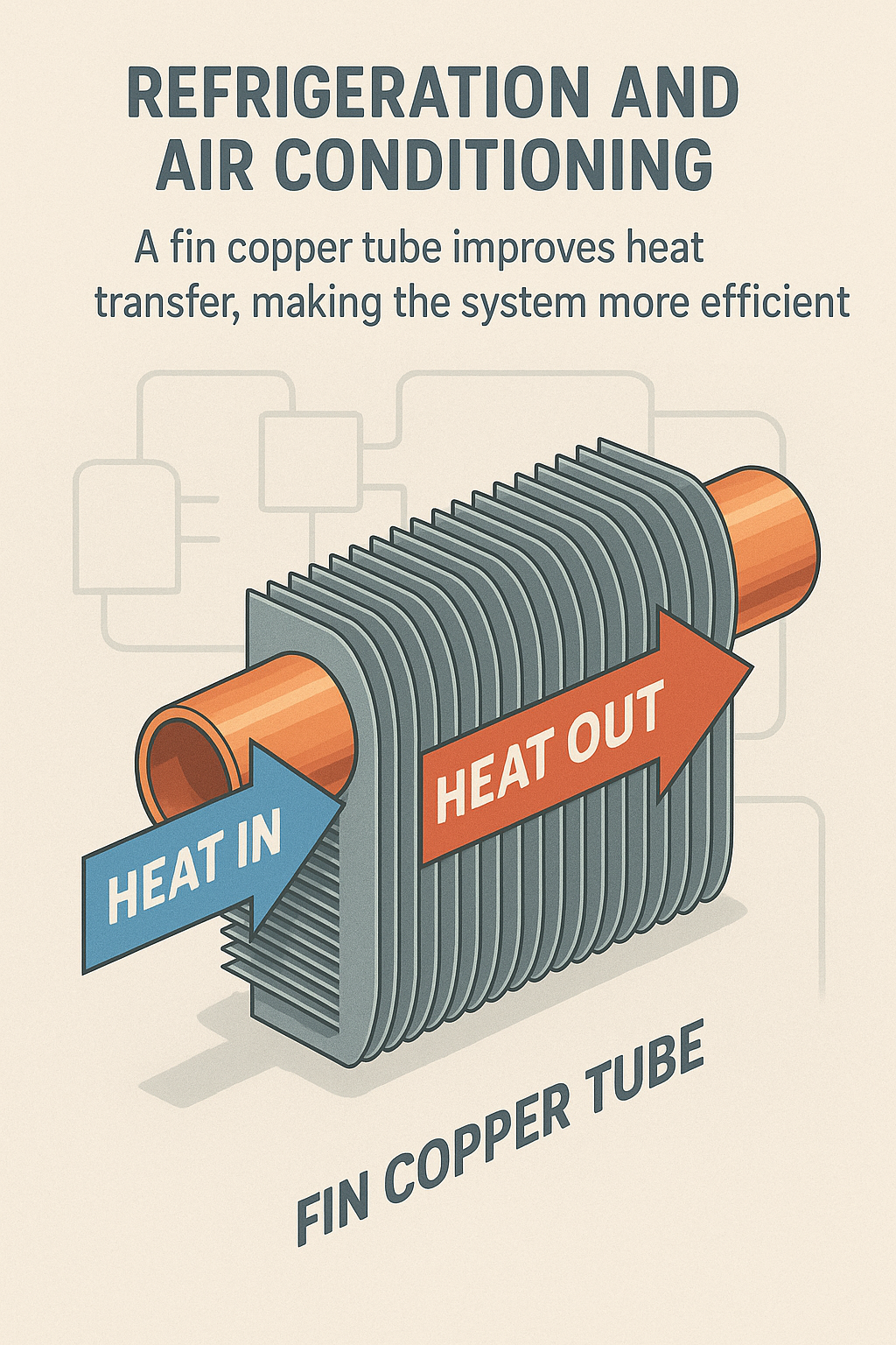 Trong các hệ thống điều hòa không khí, Ống đồng Fin được sử dụng rộng rãi trong cuộn dây bay hơi và ngưng tụ. Thiết bị bay hơi hấp thụ nhiệt từ không khí bên trong tòa nhà, trong khi thiết bị ngưng tụ giải phóng nhiệt ra môi trường ngoài trời. Việc sử dụng Ống đồng dạng vây trong cả hai bộ phận này giúp cải thiện hiệu suất truyền nhiệt tổng thể, dẫn đến hiệu suất làm mát tốt hơn và mức tiêu thụ năng lượng thấp hơn.