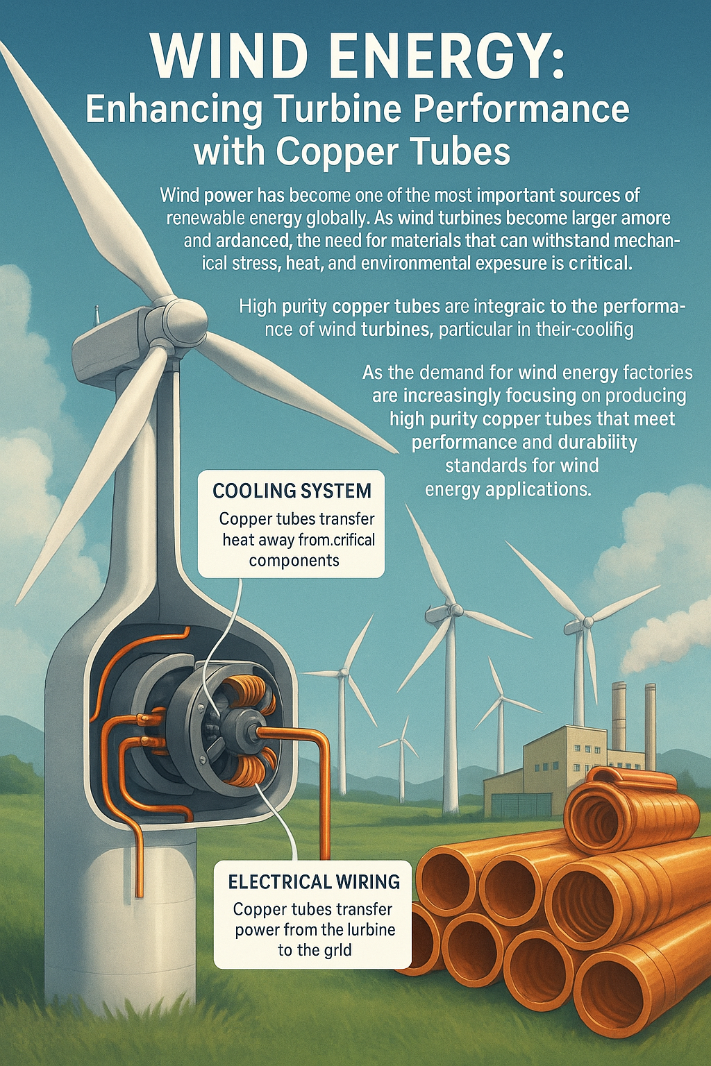 Năng lượng gió đã trở thành một trong những nguồn năng lượng tái tạo quan trọng nhất trên toàn cầu. Khi các tuabin gió ngày càng lớn hơn và tiên tiến hơn, nhu cầu về vật liệu có thể chịu được áp lực cơ học, nhiệt và tiếp xúc với môi trường là rất quan trọng. Ống đồng có độ tinh khiết cao là không thể thiếu đối với hiệu suất của tua bin gió , đặc biệt là ở họ hệ thống làm mát và electrical components.