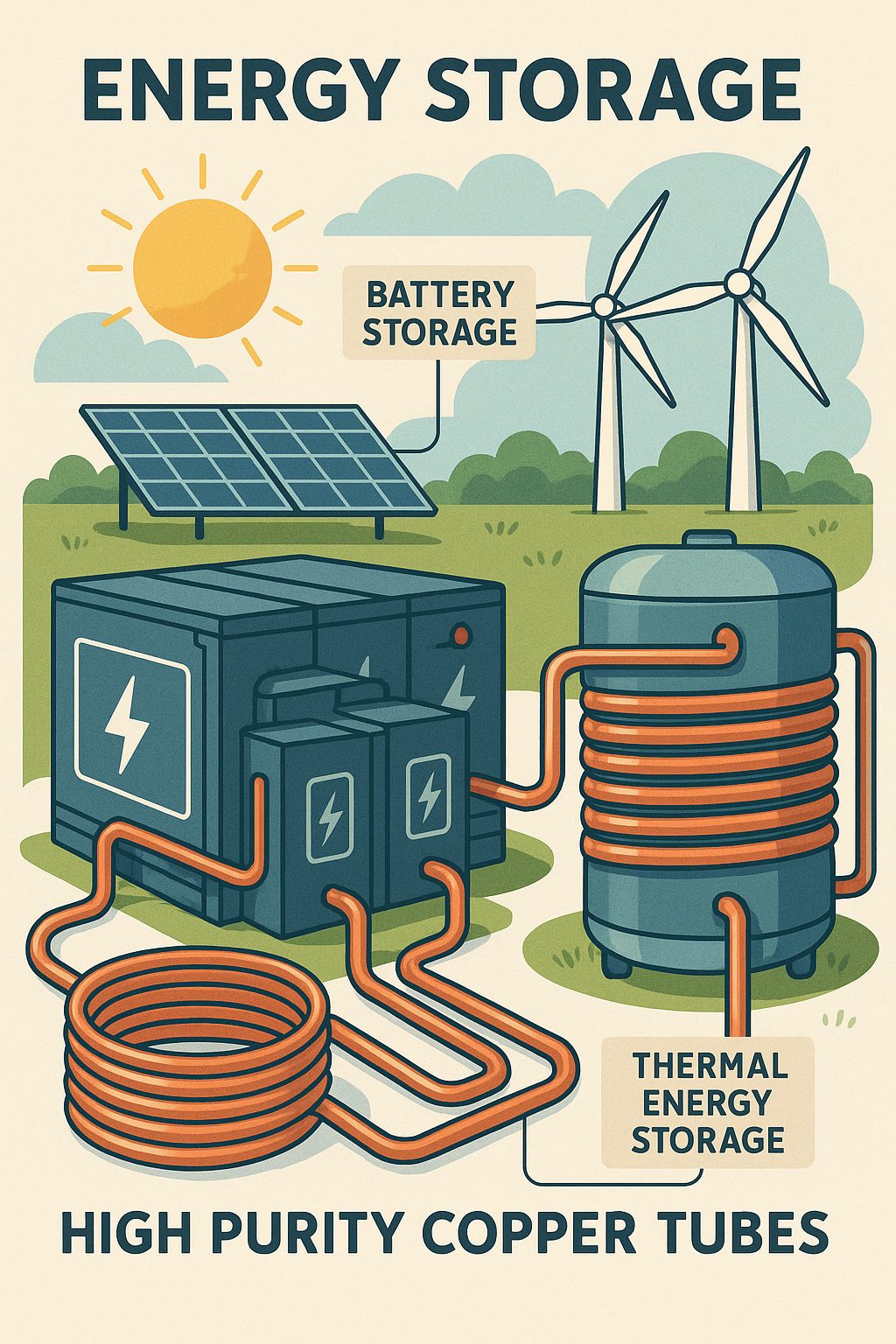 Lưu trữ năng lượng là một thành phần quan trọng của cơ sở hạ tầng năng lượng tái tạo, giúp cân bằng tính chất không liên tục của các nguồn như năng lượng mặt trời và gió. Ống đồng có độ tinh khiết cao được sử dụng trong các hệ thống lưu trữ năng lượng khác nhau, bao gồm pin và hệ thống lưu trữ nhiệt . Các hệ thống này yêu cầu các bộ phận có thể quản lý nhiệt và điện một cách hiệu quả để đảm bảo hiệu suất đáng tin cậy.