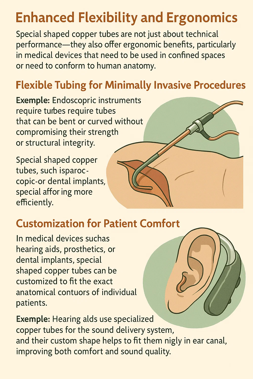 Trong các thiết bị y tế như máy trợ thính , chân tay giả hoặc cấy ghép nha khoa , ống đồng có hình dạng đặc biệt có thể được tùy chỉnh để phù hợp với đường nét giải phẫu chính xác của từng bệnh nhân. Tùy chỉnh này cải thiện cả sự thoải mái và hiệu quả của thiết bị.
