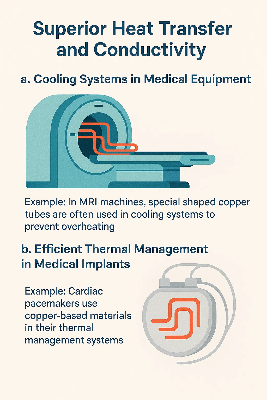 Đồng nổi tiếng vì nó độ dẫn nhiệt vượt trội , làm cho nó trở thành vật liệu lý tưởng cho các ứng dụng yêu cầu trao đổi nhiệt . Ống đồng có hình dạng đặc biệt tận dụng đặc tính này trong các thiết bị y tế khác nhau, đặc biệt là trong hệ thống làm mát hoặc trao đổi nhiệtrs .